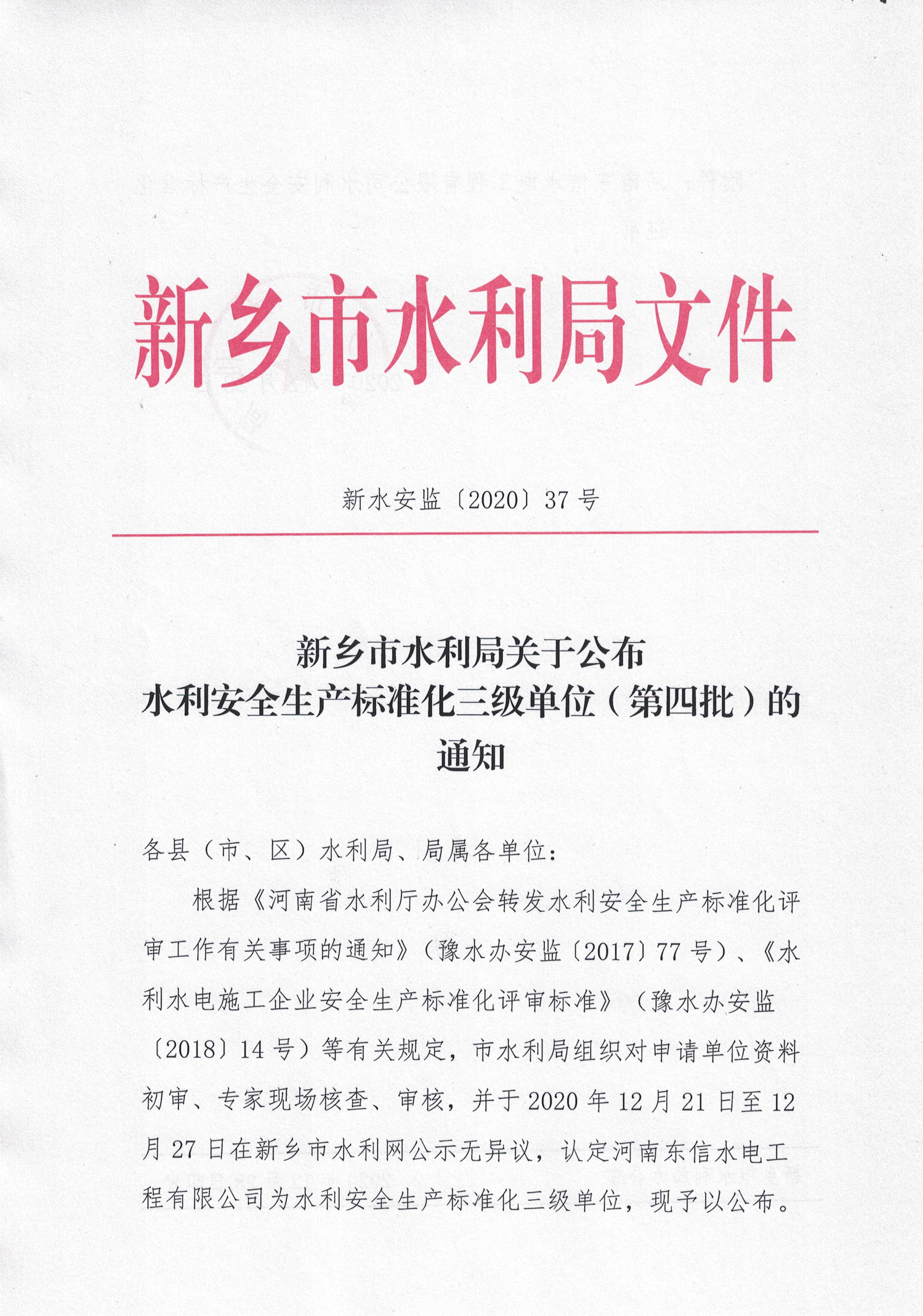 新乡市水利局关于公布水利安全生产标准化三级单位(第四批)的通知