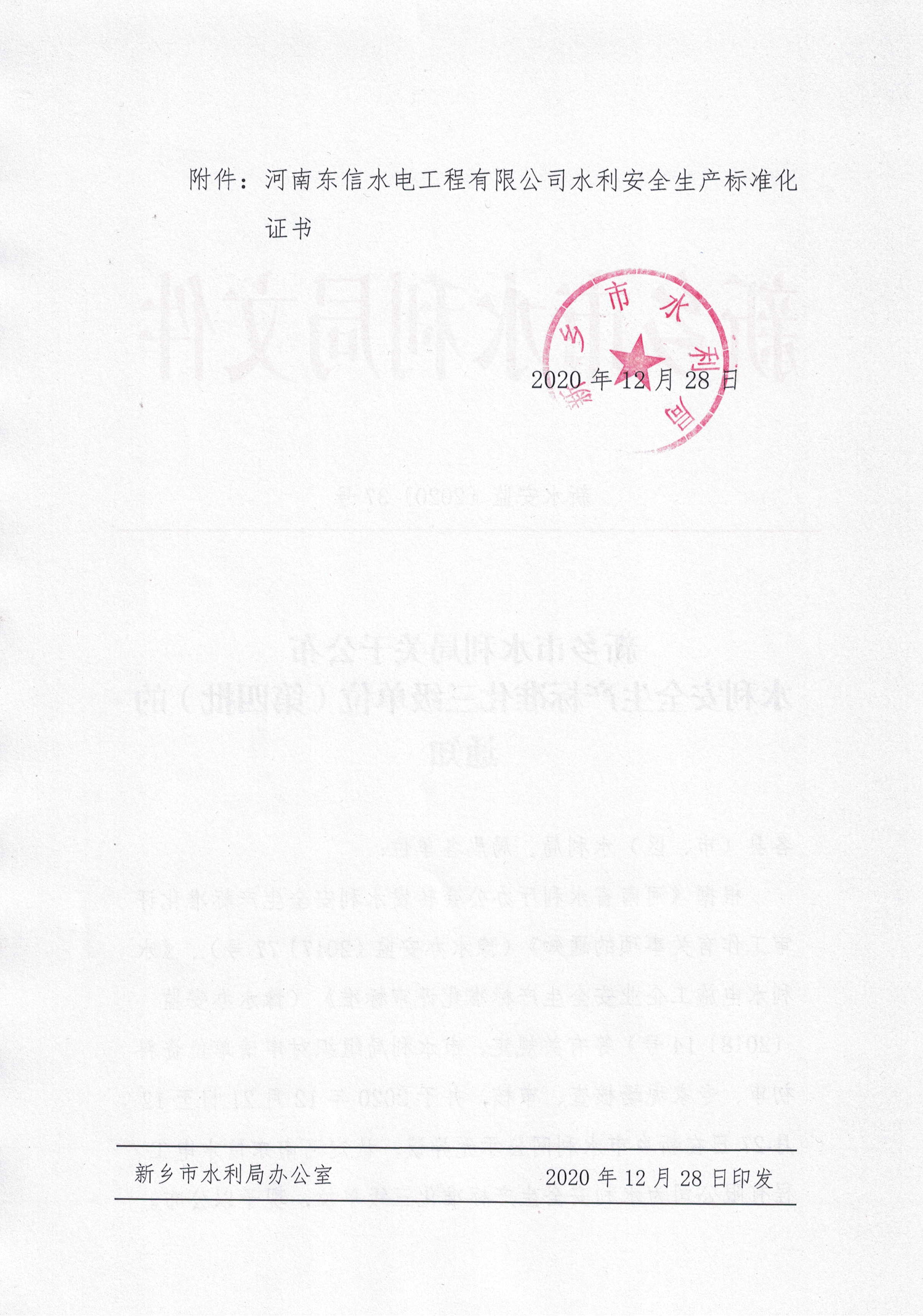 新乡市水利局关于公布水利安全生产标准化三级单位(第三批)的通知