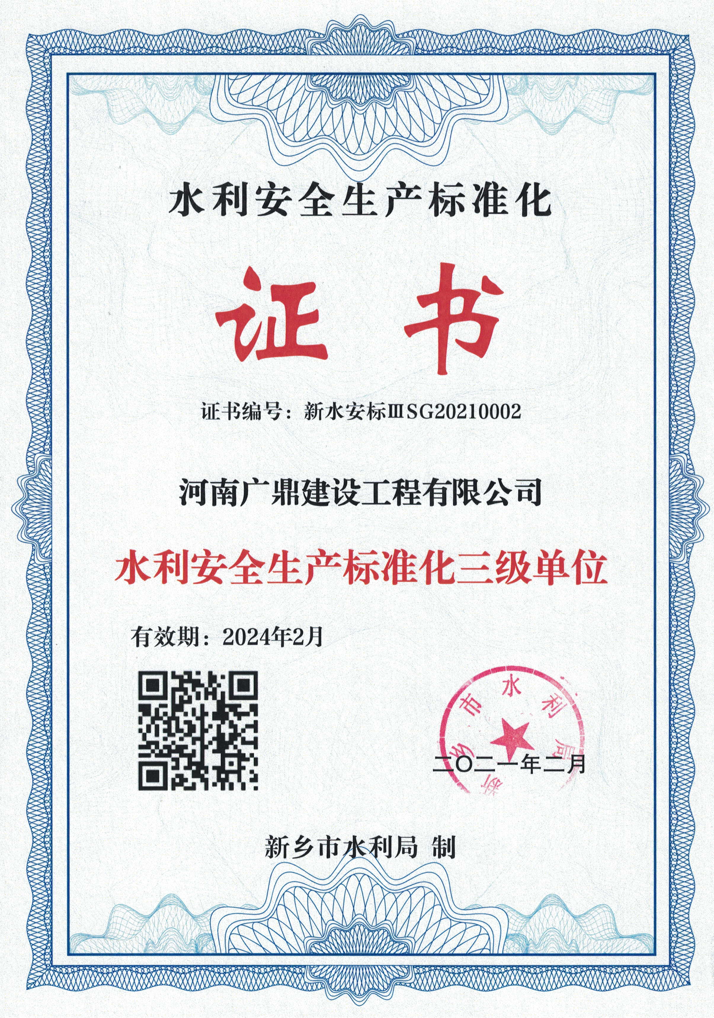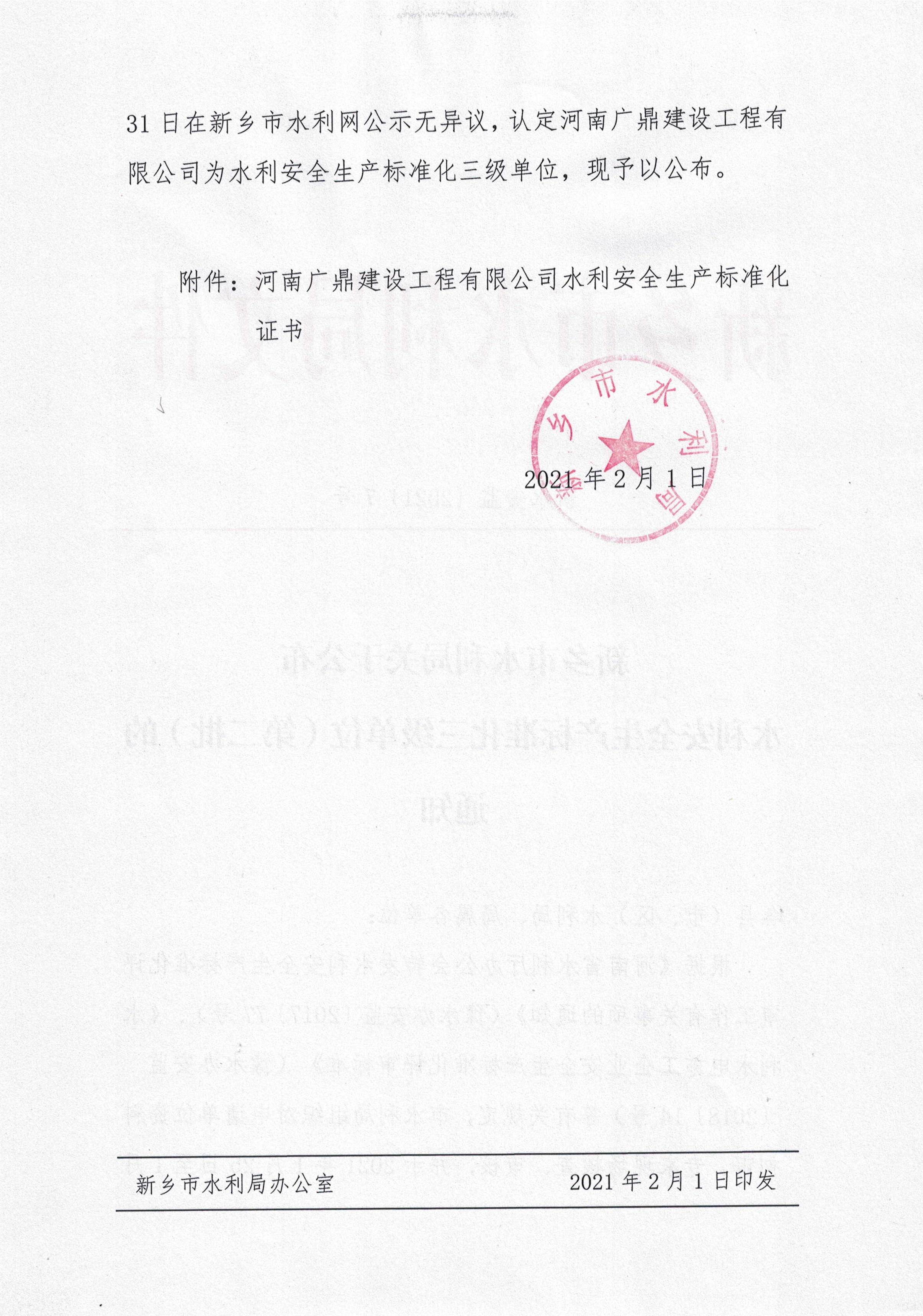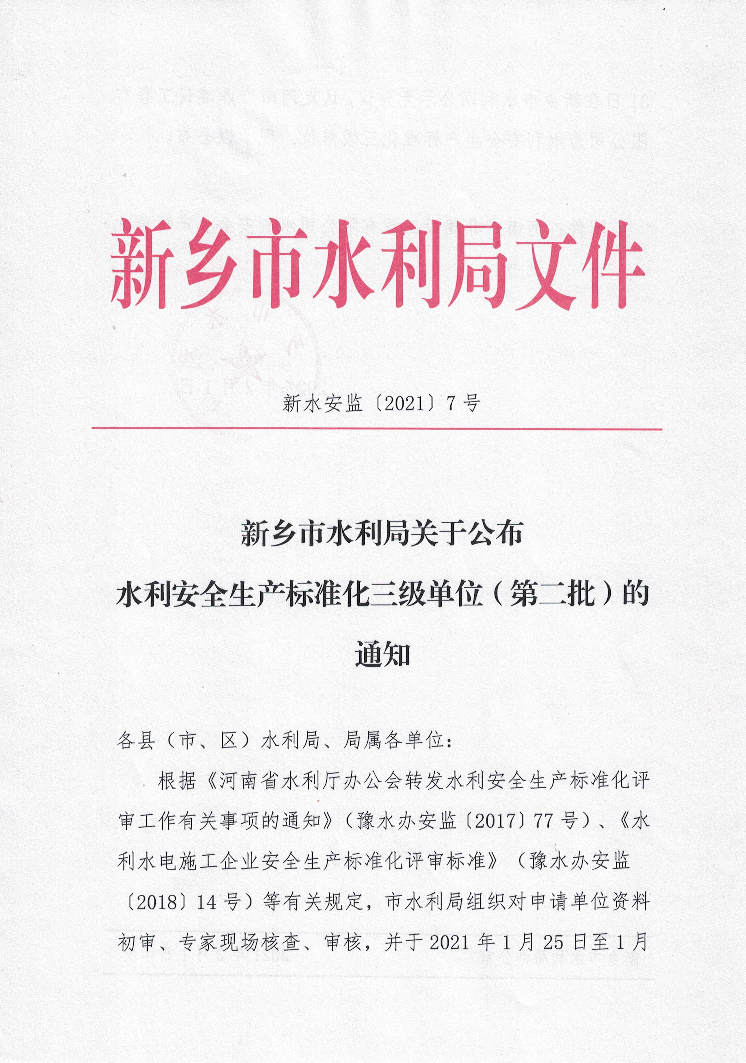 新乡市水利局关于公布水利安全生产标准化三级单位(第三批)的通知