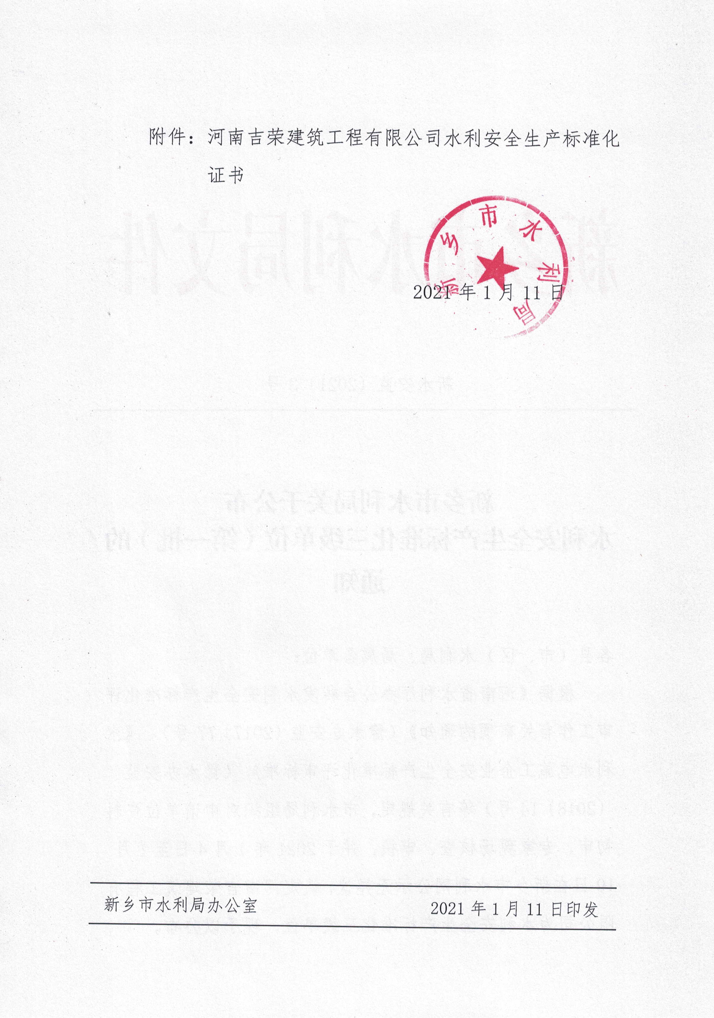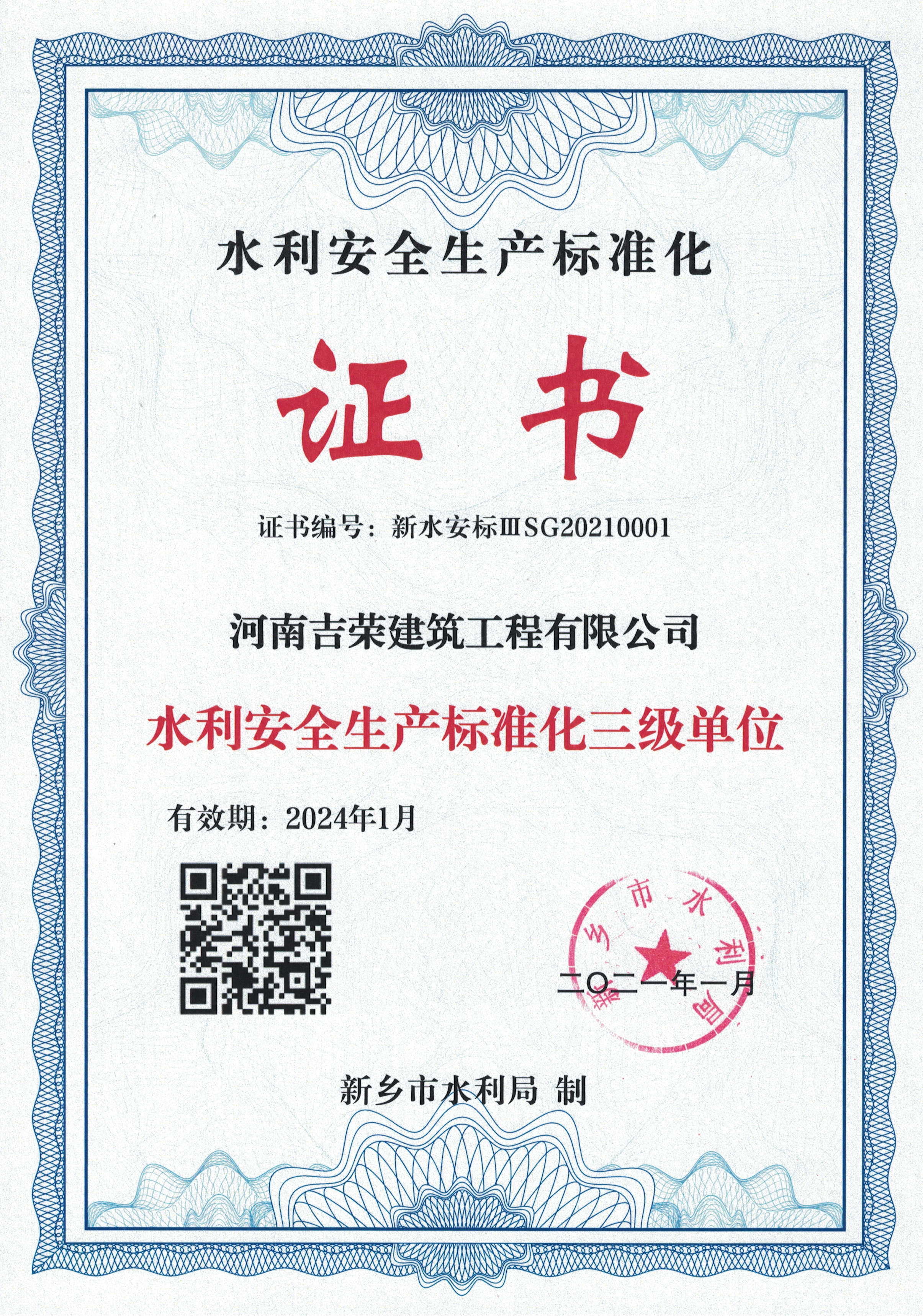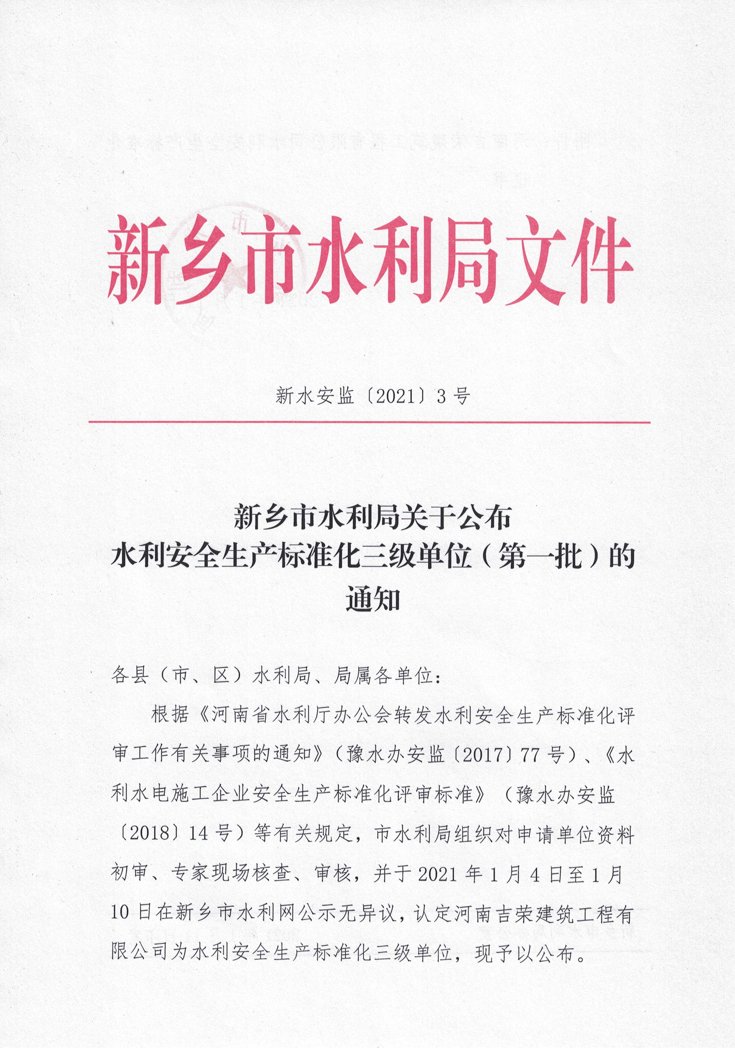 新乡市水利局关于公布水利安全生产标准化三级单位(第三批)的通知