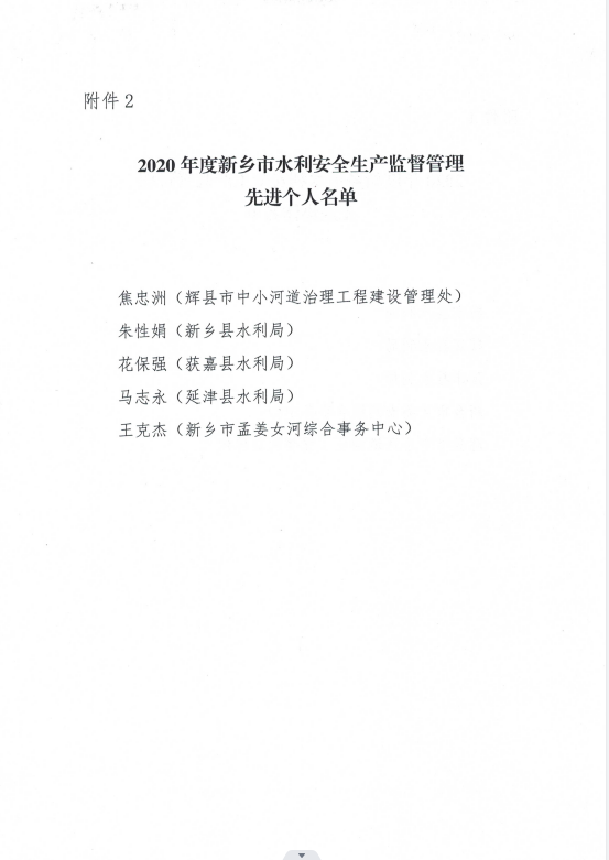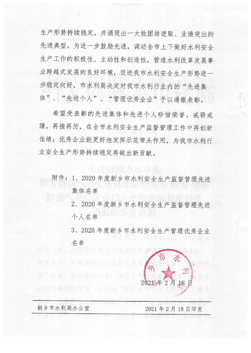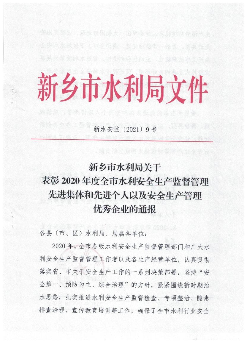 新乡市水利局关于表彰2020年度全市水利安全生产监督管理先进集体和先进个人以及安全生产管理优秀企业的通报