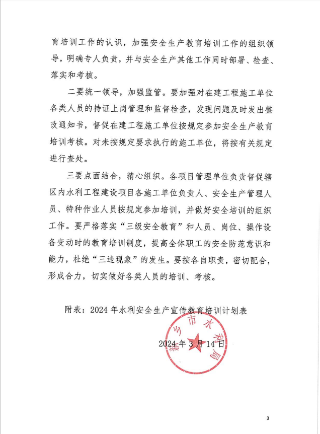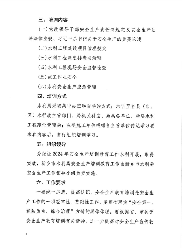 2024年新乡市水利局安全生产教训培训工作计划