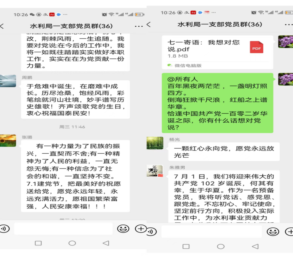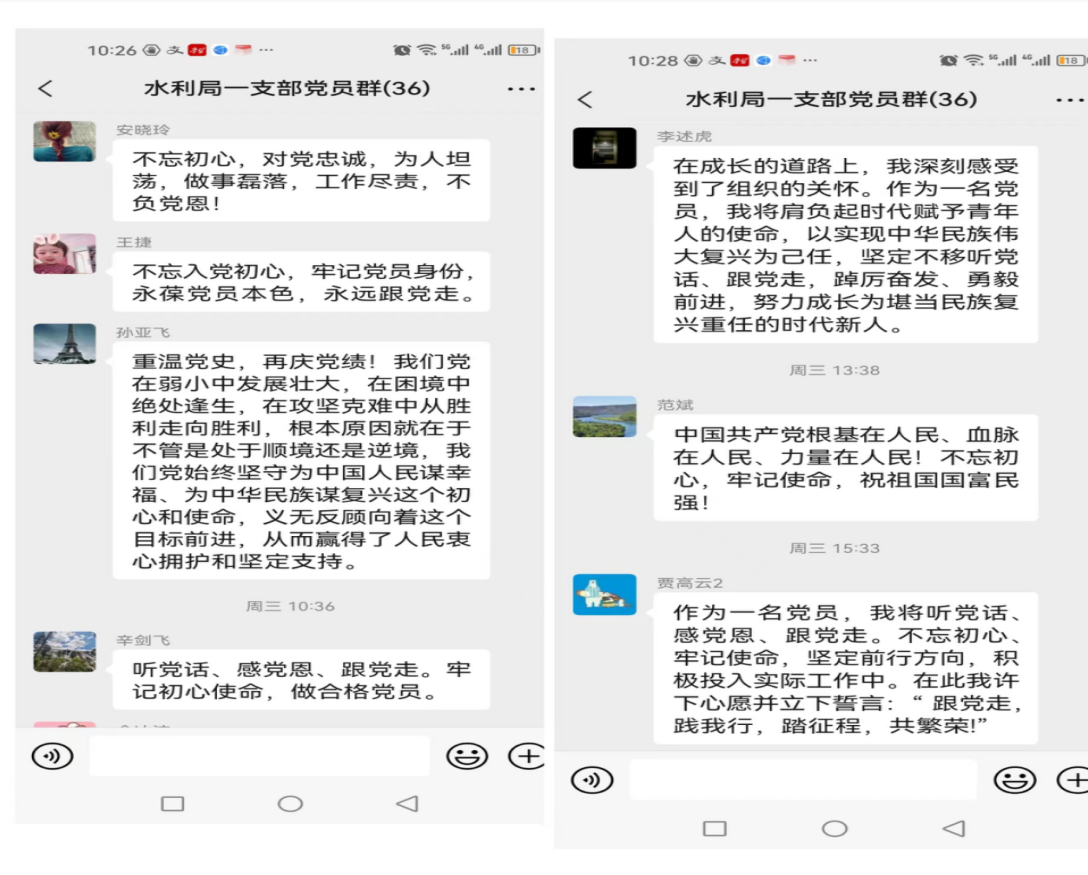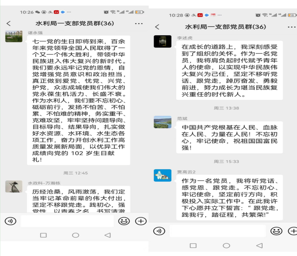 为进一步弘扬爱党精神、传递党员情怀,一支部在六月下旬开始利用支部工作群、小组群等多种线上途径,推出“我想对党说”七一寄语专题,倾听党员群众述说初心、对党来一次真情告白、向党的生日献礼。大家用自己朴实真挚的语言,表达了奋进新征程的感想与展望,纷纷表态,继续努力,奋力拼搏,做好本职工作,为新乡水利高质量发展做出自己最大的贡献。