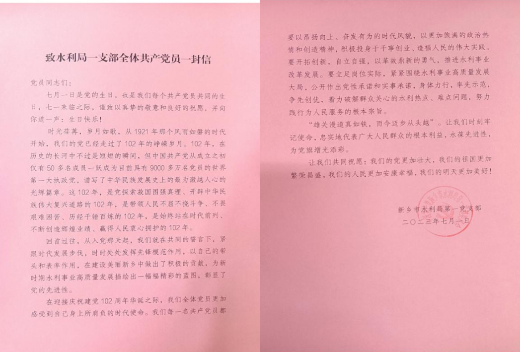 “七月一日是党的生日,也是我们每个共产党员共同的生日,七一来临之际,谨致以真挚的敬意和良好的祝愿,并向你道一声:生日快乐!” 这是在“迎七一”主题党日活动中,以支部的名义写给全体党员的一封信。信中回顾党百年波澜壮阔的历程,展望了美好未来,并提出了殷切期望。希望全体党员牢记身上所肩负的时代使命,积极投身于干事创业、造福人民的伟大实践。