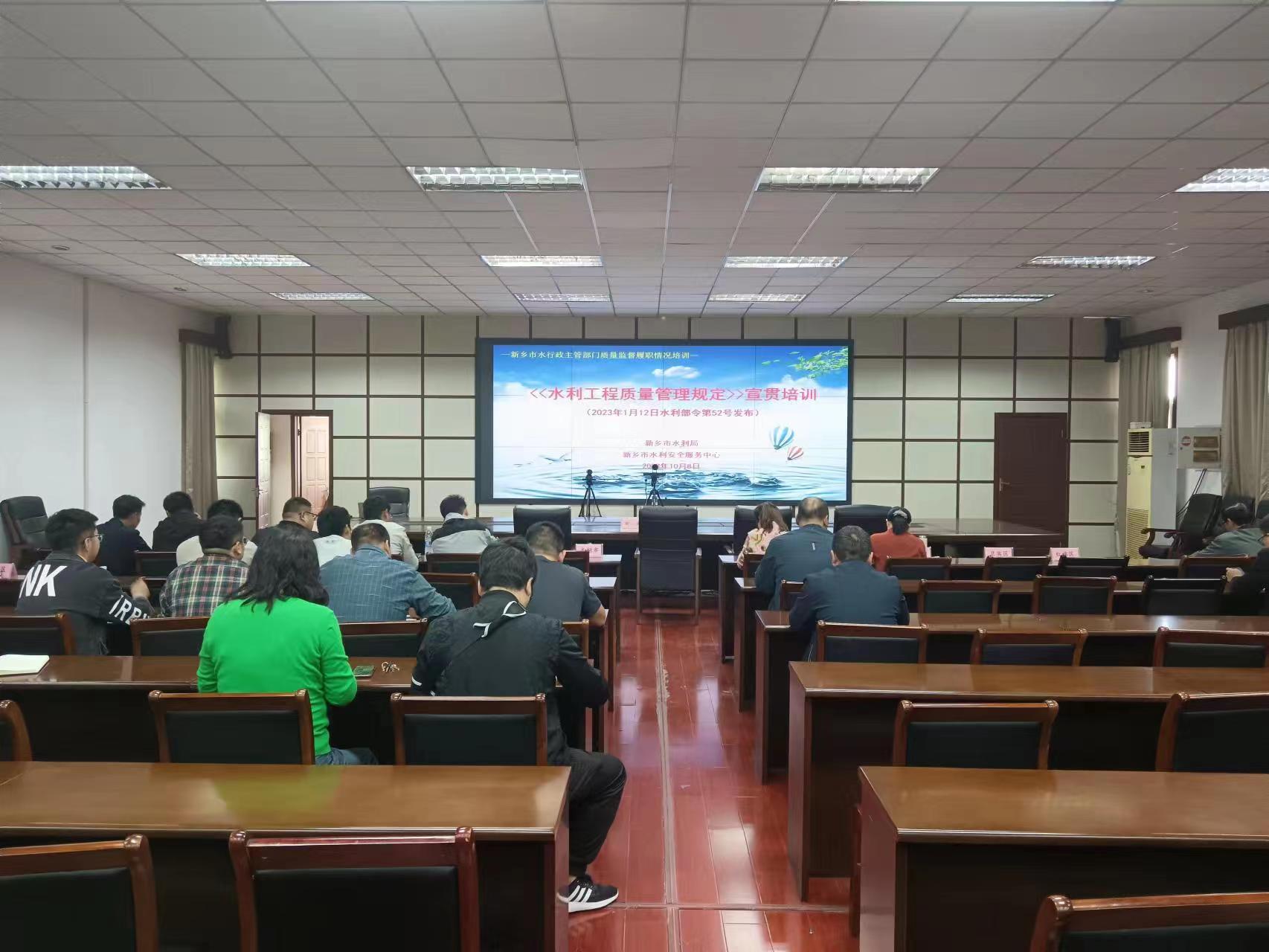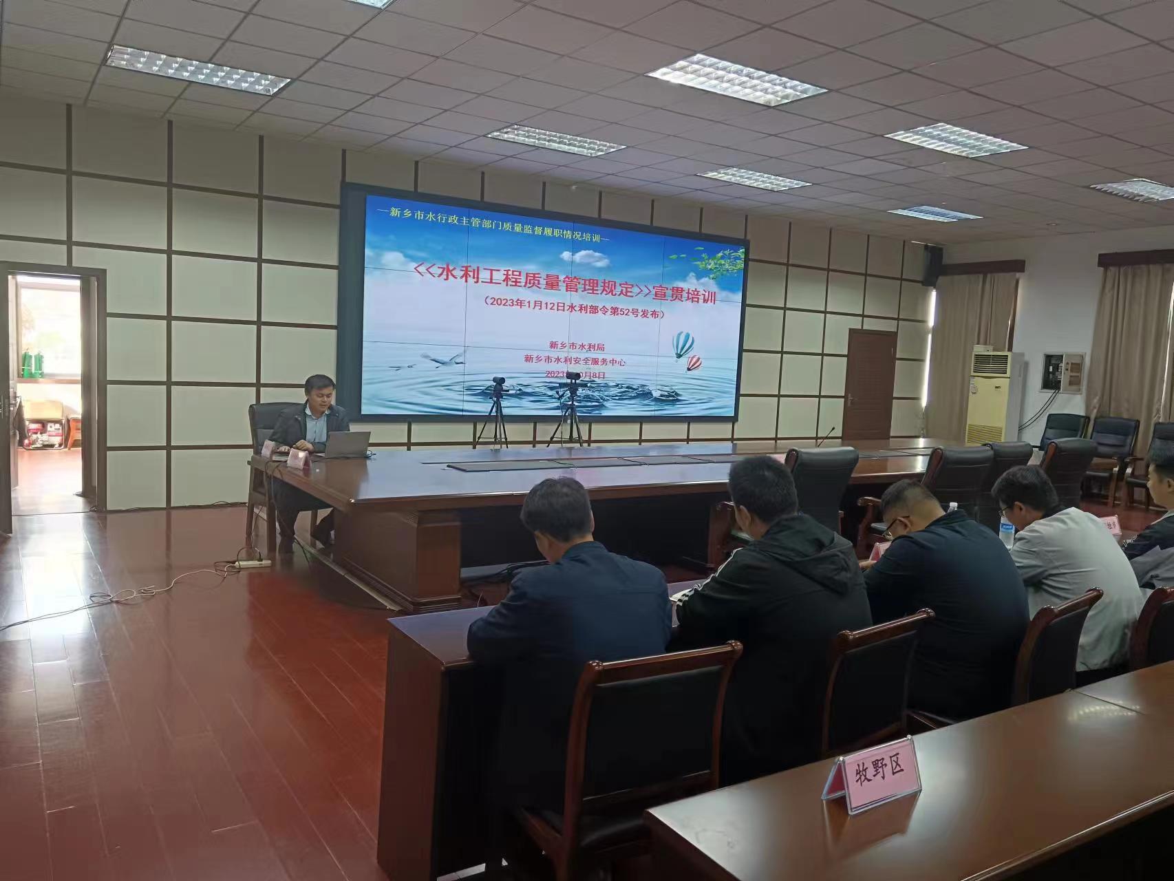 2023年10月8日,新乡市水利局组织召开全市水行政主管部门质量监督履职情况培训会议。水利工程建设与监督科科长曹熹主持会议,市水利安全服务中心、各县(市、区)质量监督机构的负责人和质量监督人员参加会议。