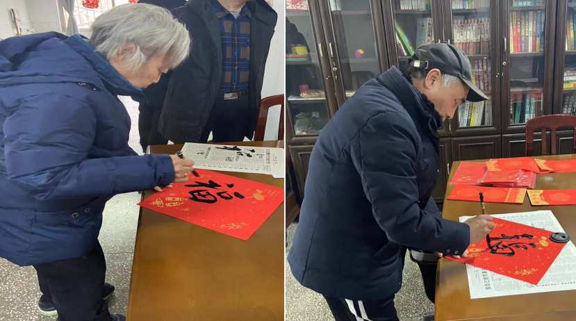 来自水利科技推广中心的书法家翟敬栓、成刚强、周长社,以及退休干部吴正芬当场写作春联,现场墨香四溢,喜乐融融。“春回大地万物苏,福满人间喜气盈”“龙腾盛世千家乐,春满神州万物昌”一幅幅饱含热情和喜气的春联和“福”字在书法家的笔下诞生,变化的字体,美好的祝愿,喜庆的红纸上,墨色点缀,新春祝福蔓延整个活动现场。