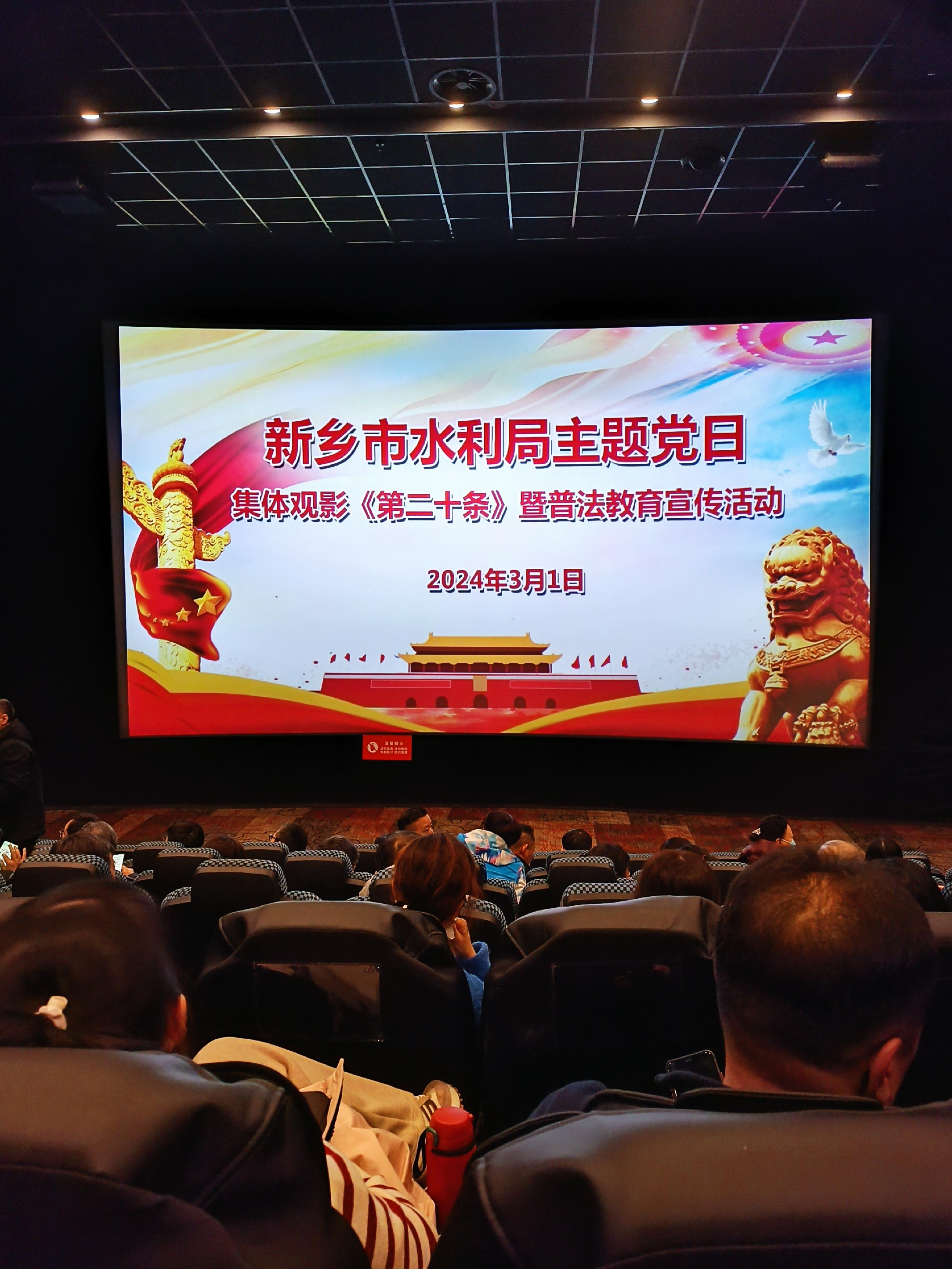 为弘扬法治精神、增强法治观念,提升党员干部遵法守法意识和法治思维能力,2024 年 3 月 1 日,市水利局组织开展主题党日集体观影《第二十条》暨普法宣传活动,局机关及局属各单位 170 余名在职党员参加观影。