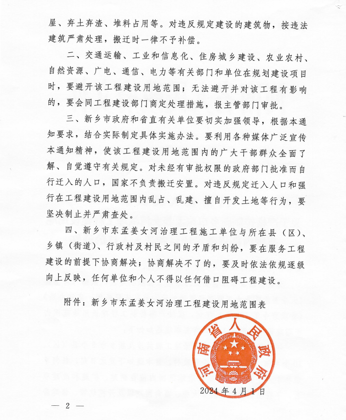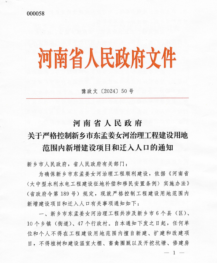 河南省人民政府关于严格控制新乡市东孟姜女河治理工程建设用地范围内新增建设项目和迁入人口的通知