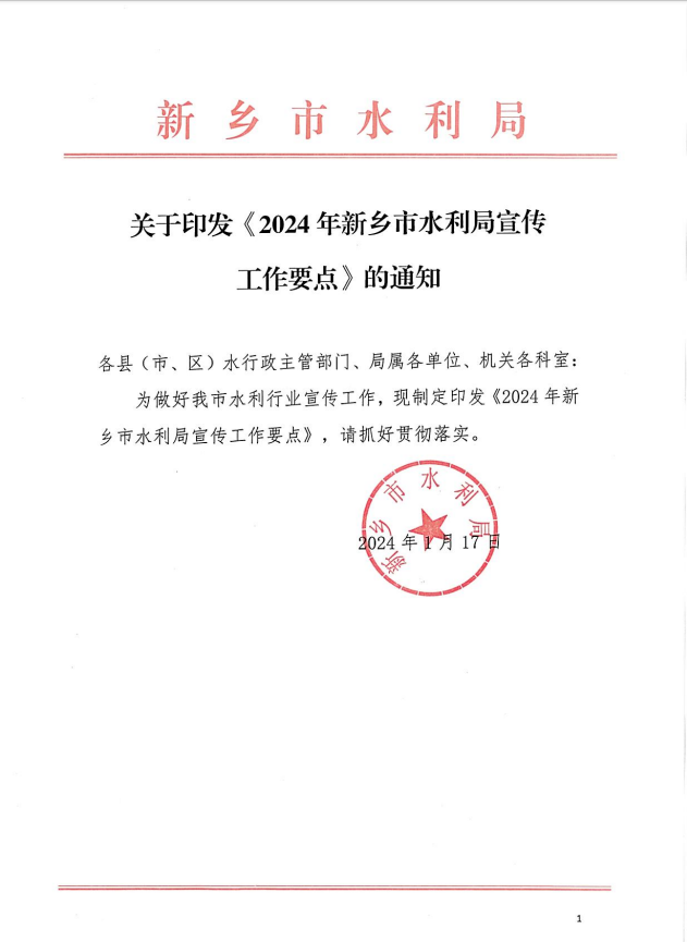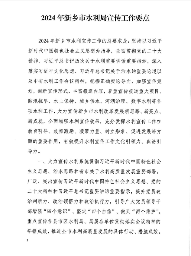关于印发《2024年新乡市水利局宣传工作要点》的通知