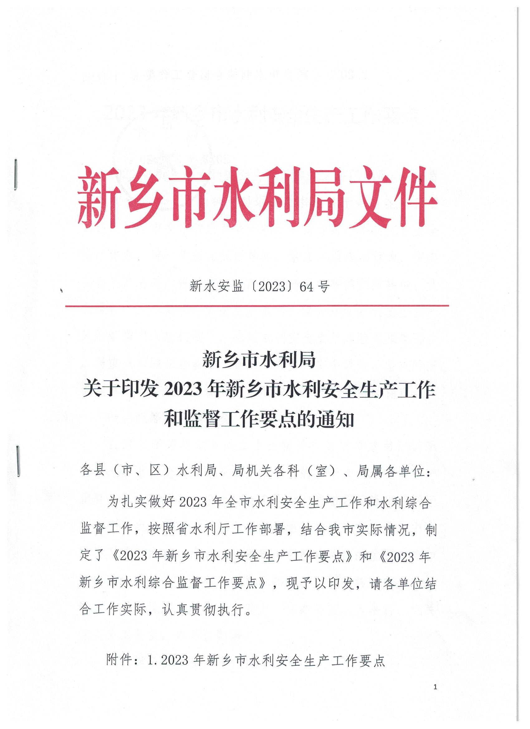 新乡市水利局关于印发2023年新乡市水利安全生产工作和监督工作要点的通知